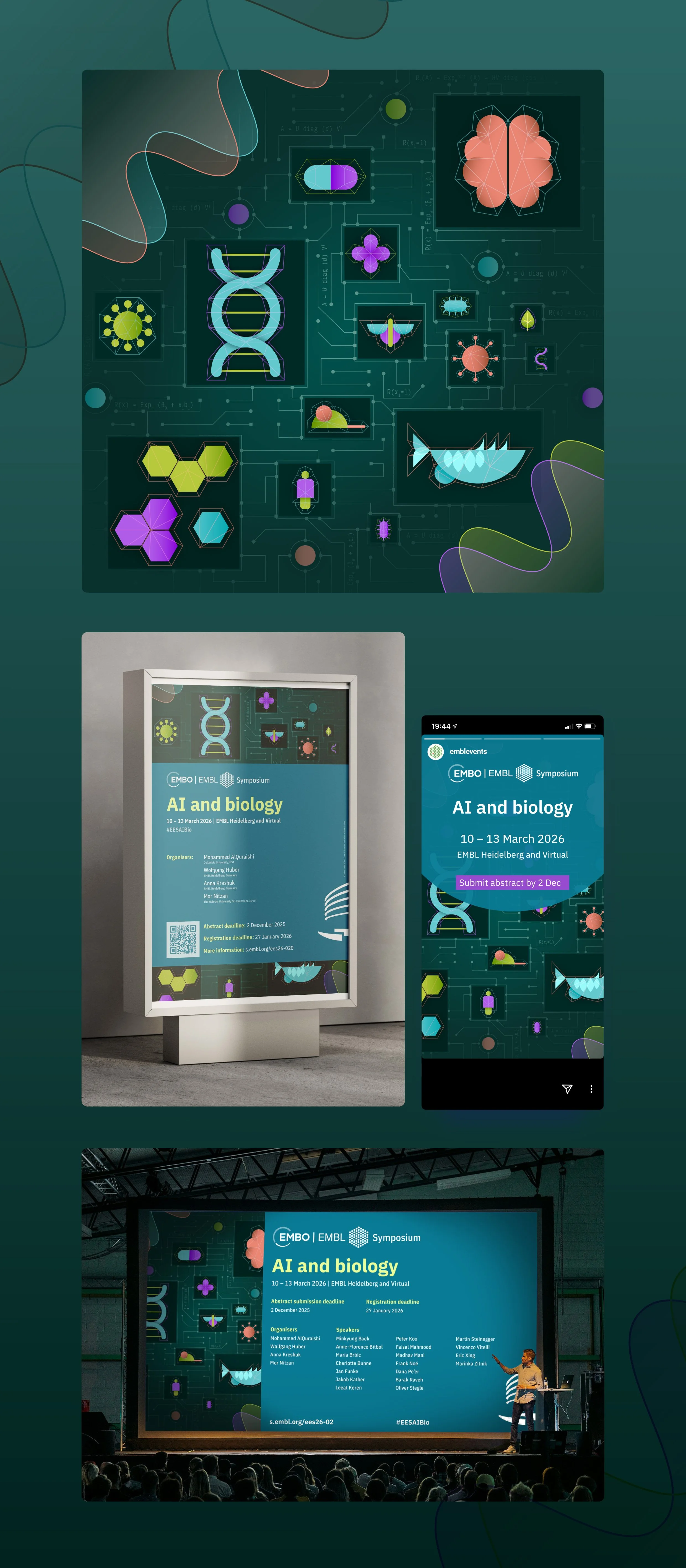 After working with scientific organizers, a better understanding of the theme is translated into thought provoking illustrations. Rather than data driven charts or infographics, illustrations were used to connect cutting edge scientific discoveries to something more relatable to our every day lives for scientists and non-scientists alike. The result was an array of futuristic, abstract data representations.